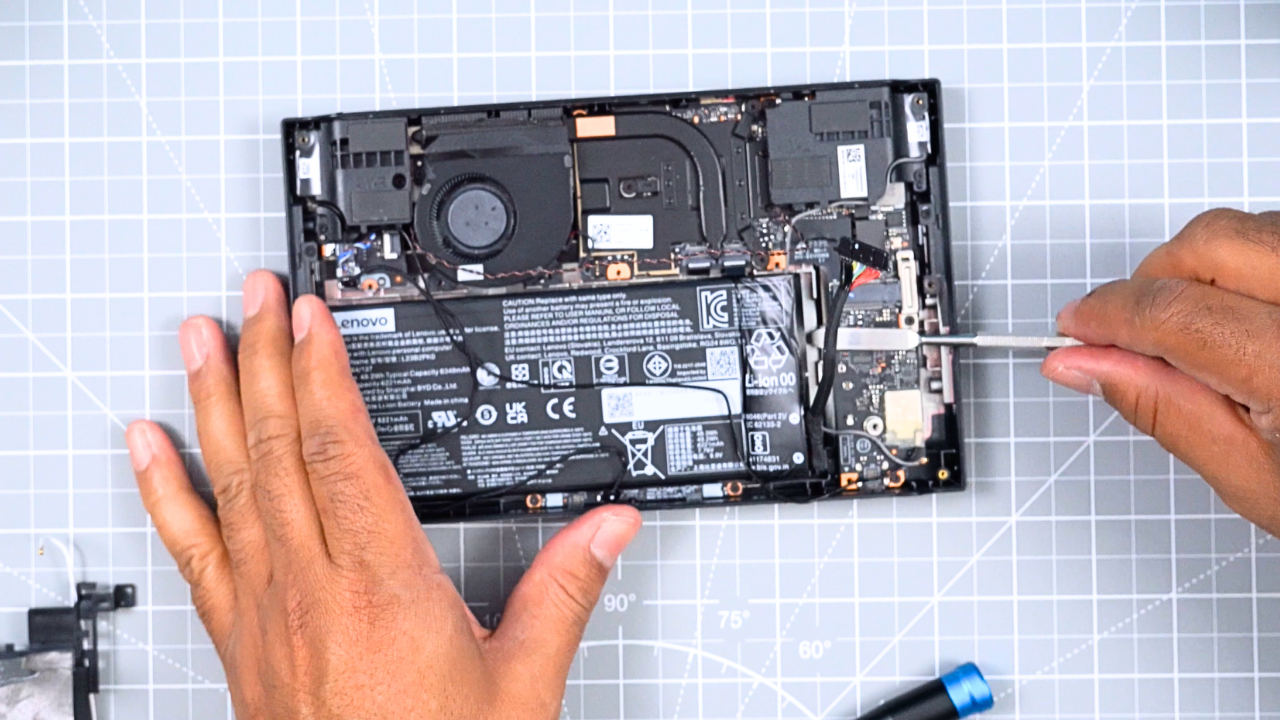 To ensure I was following the correct procedure, I referred to Lenovo’s hardware maintenance manual for the Legion Go. The manual detailed removing five screws to detach the battery bracket. With a pry tool, I carefully slid off the battery cables and pulled two tabs on the right side—likely meant to loosen the adhesive holding the battery in place.